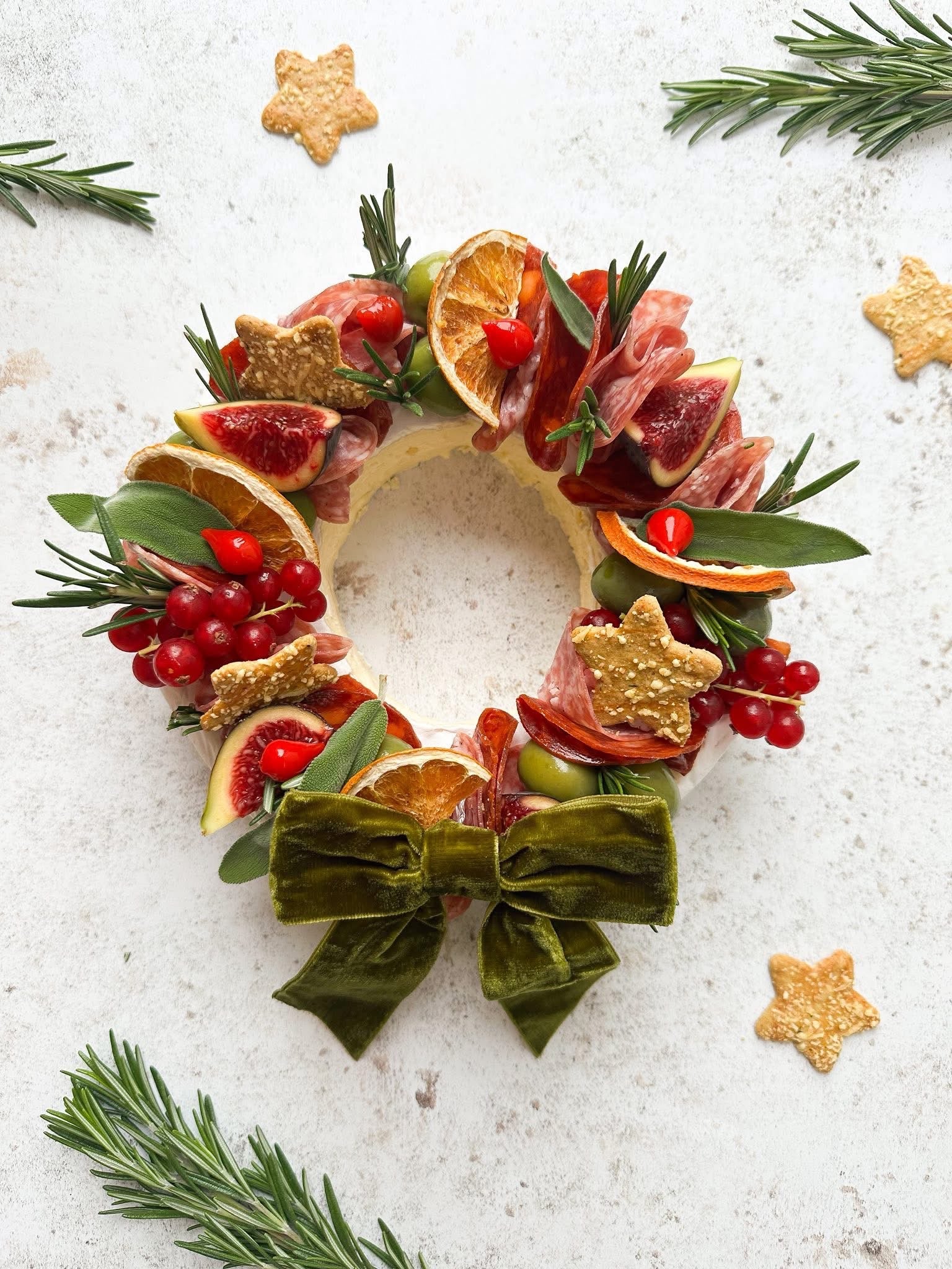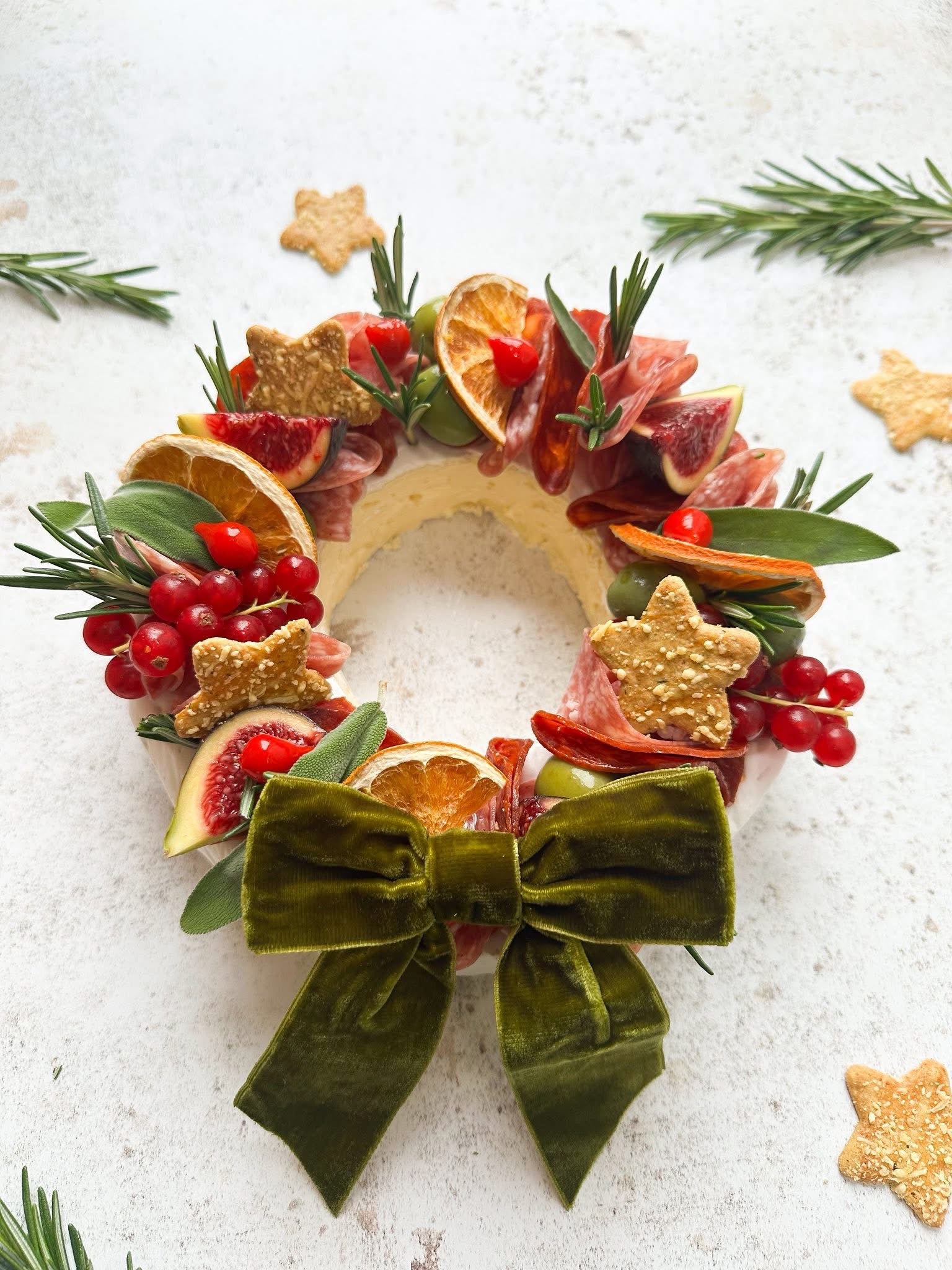 A creamy French Brie topped with luxury charcuterie, Olives, seasonal fruits, charcuterie and finished with a cute green velvet bow.